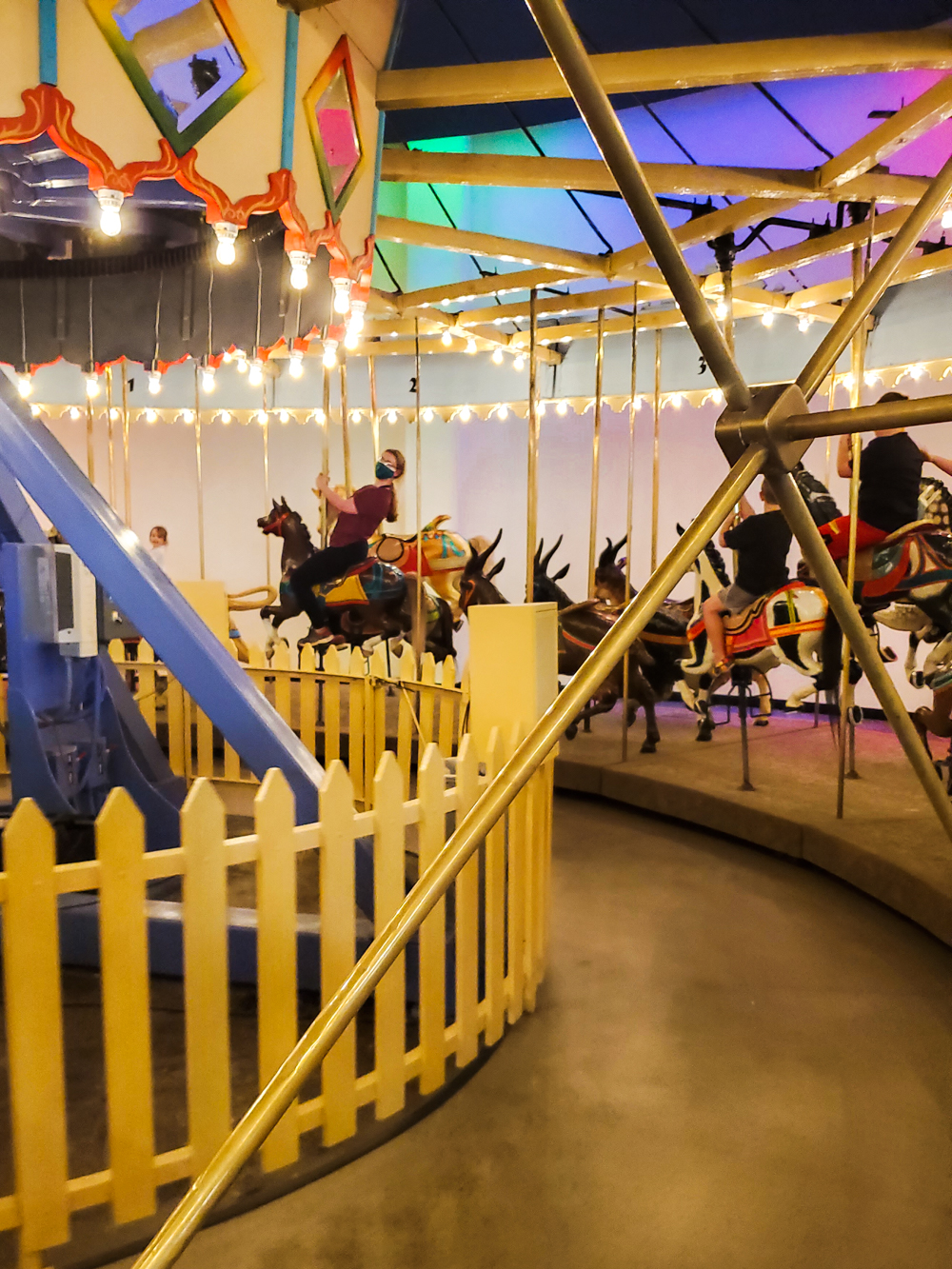 The kids were all "WHAT?!?" with big eyes, so I said, "Look over there," and pointed into the adjacent gallery, where the big carousel was going, music blaring, kids riding all the animals, looking like a literal kindergartner's dream come true.