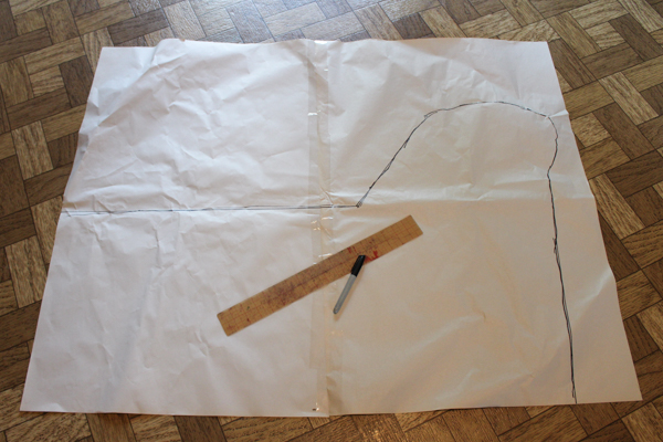 Trace the edges of the couch onto the paper. When you've got the outline, lay it flat on the floor and use a straightedge and a french curve to help you neaten the lines. You can also add an inch of seam allowance.