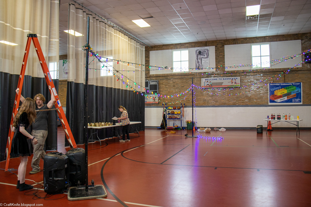I wasn't completely opposed to hosting the party at home, but since it *was* meant to be a school dance, we thought it would be cool to host it somewhere that had more of a school dance look, so we rented the gymnasium in one of our local community centers for an evening. Because it was a city space it was rentable for a terrific price, and we had a full kitchen available, bathrooms that we didn't have to clean, a ton of room, tables and chairs, a speaker system, and just enough of what I'm assuming were volleyball or badminton net posts standing in a corner that my partner could set up the twinkly lit dance floor of my dreams: